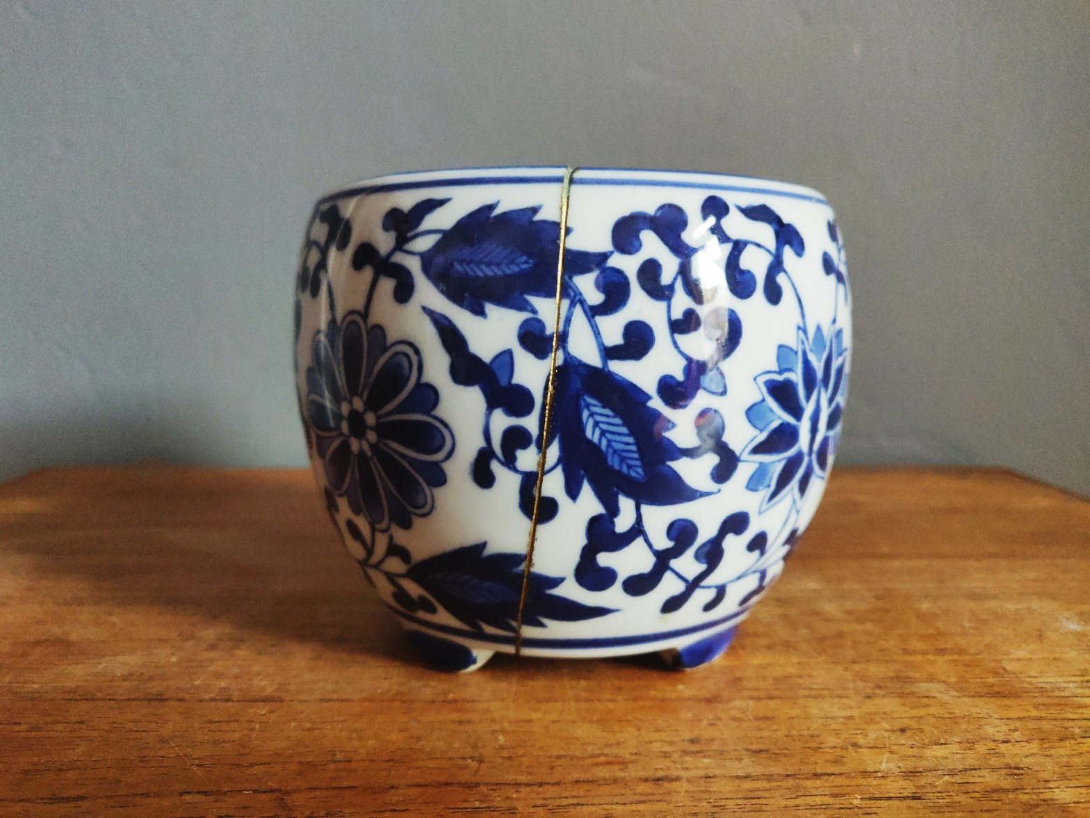 I am back to blogging, possibly in a shorter format. Today I was inspired by the idea of repair. A long time ago I bought a pretty pot from the charity shop. It was painted with a blue floral pattern and has spent a happy life in our bathroom, stuffed full of toothbrushes and tubes of toothpaste.